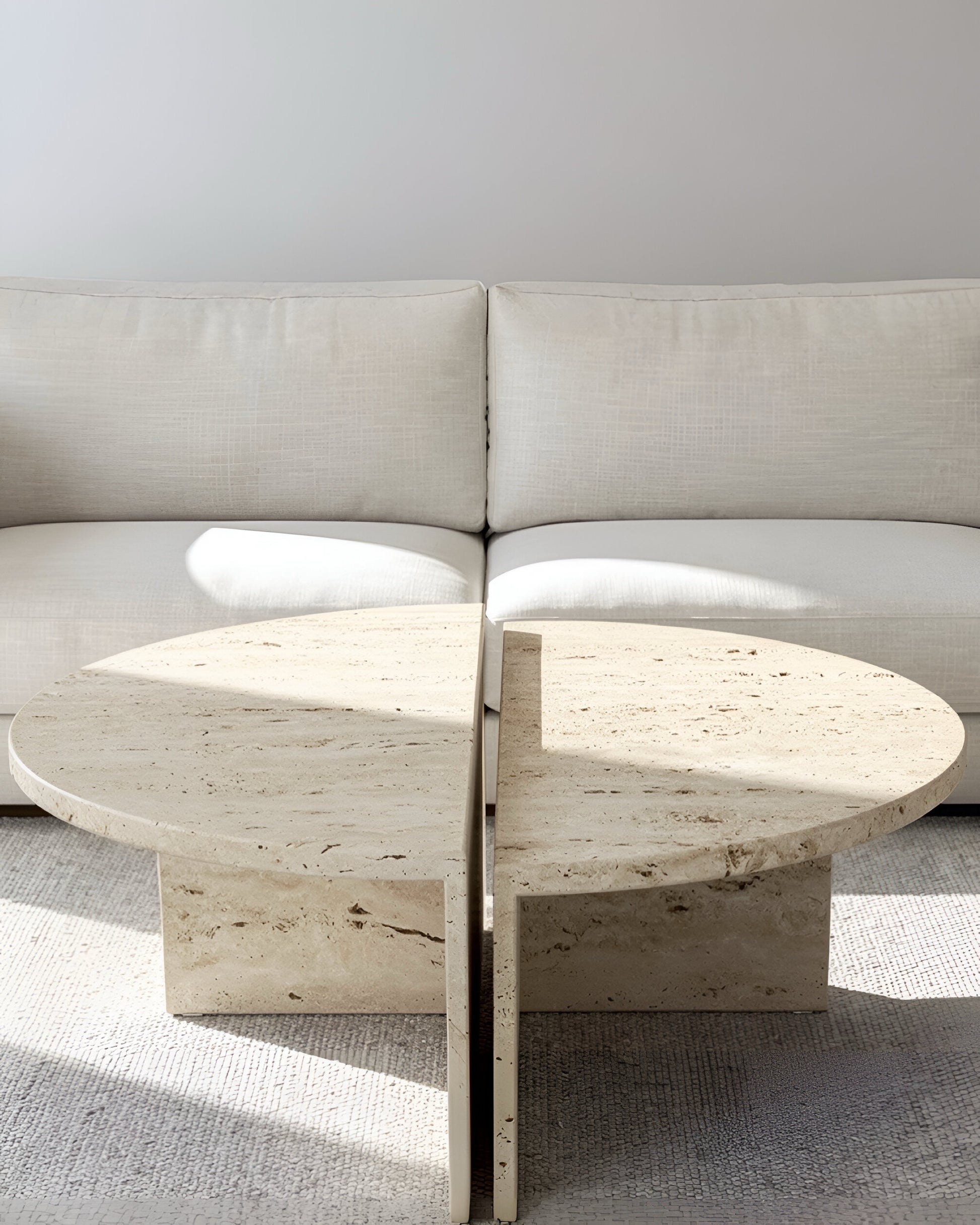 Amaray vereint geometrische Präzision mit der organischen Schönheit marokkanischen Travertins. Das Set aus zwei korrespondierenden Halbkreisen bietet maximale Flexibilität: Als skulpturales Zentrum im Wohnzimmer oder getrennt als dynamische Akzente. Zeitloses Design, das moderne Eleganz und natürliche Beständigkeit in Ihr Zuhause bringt.