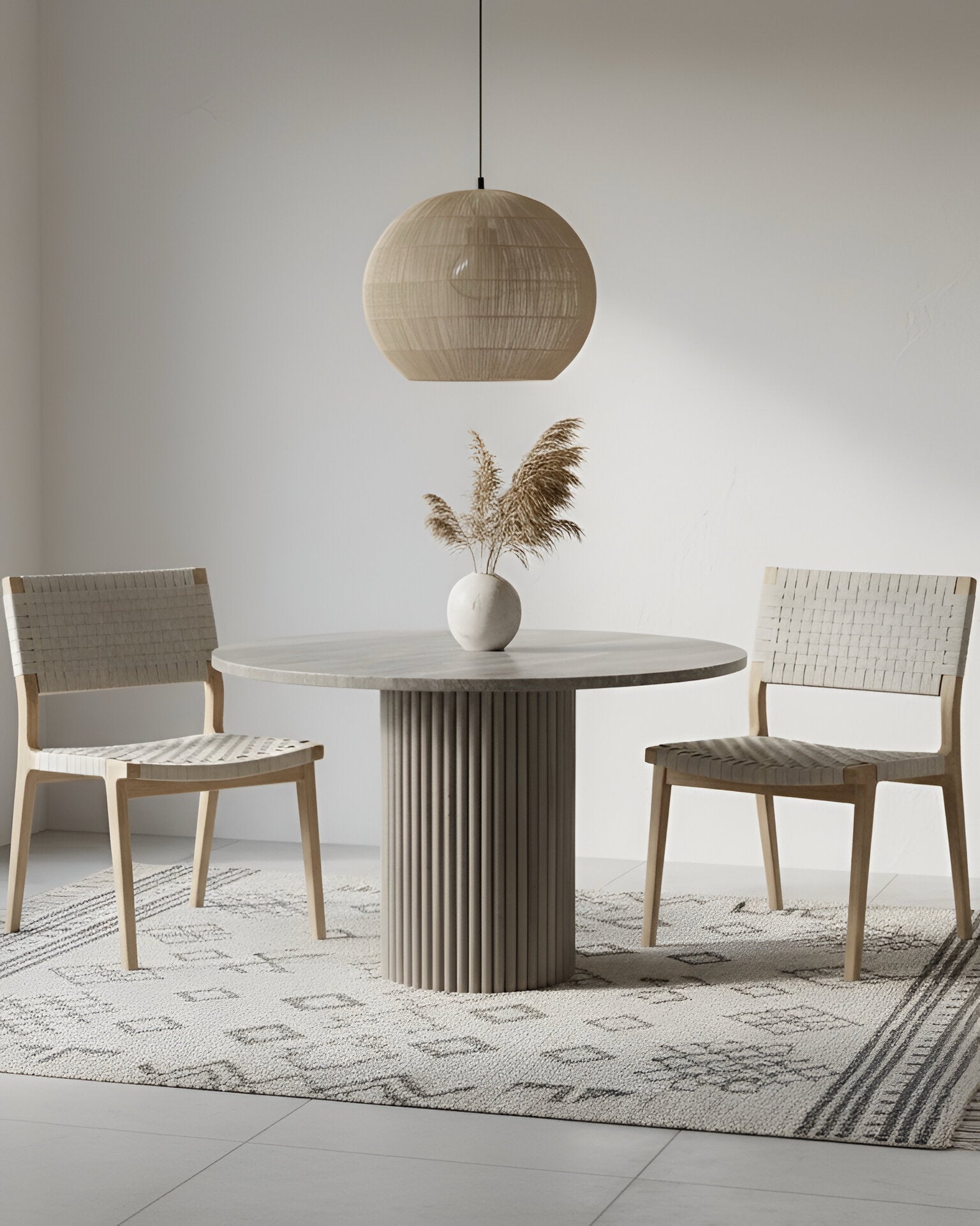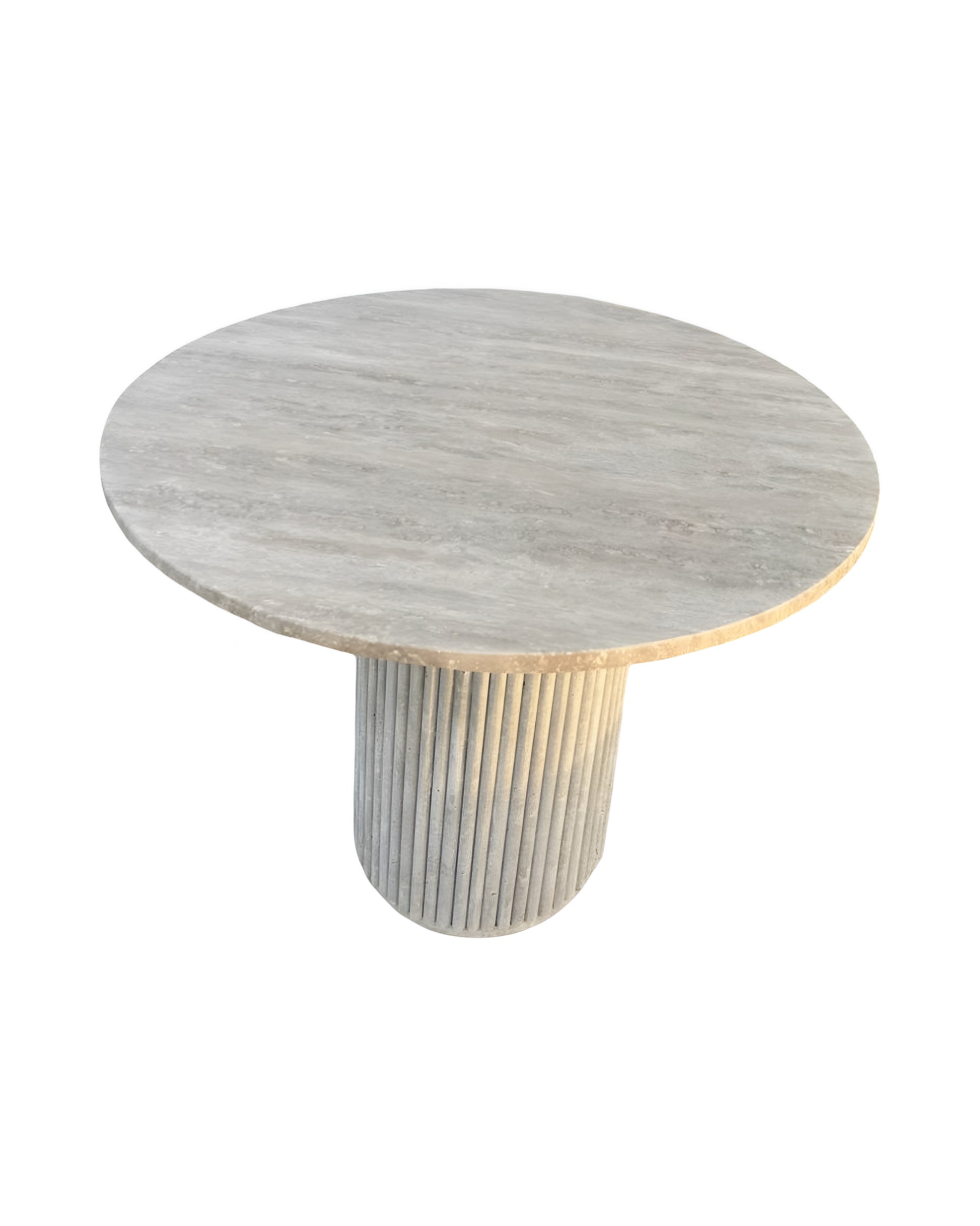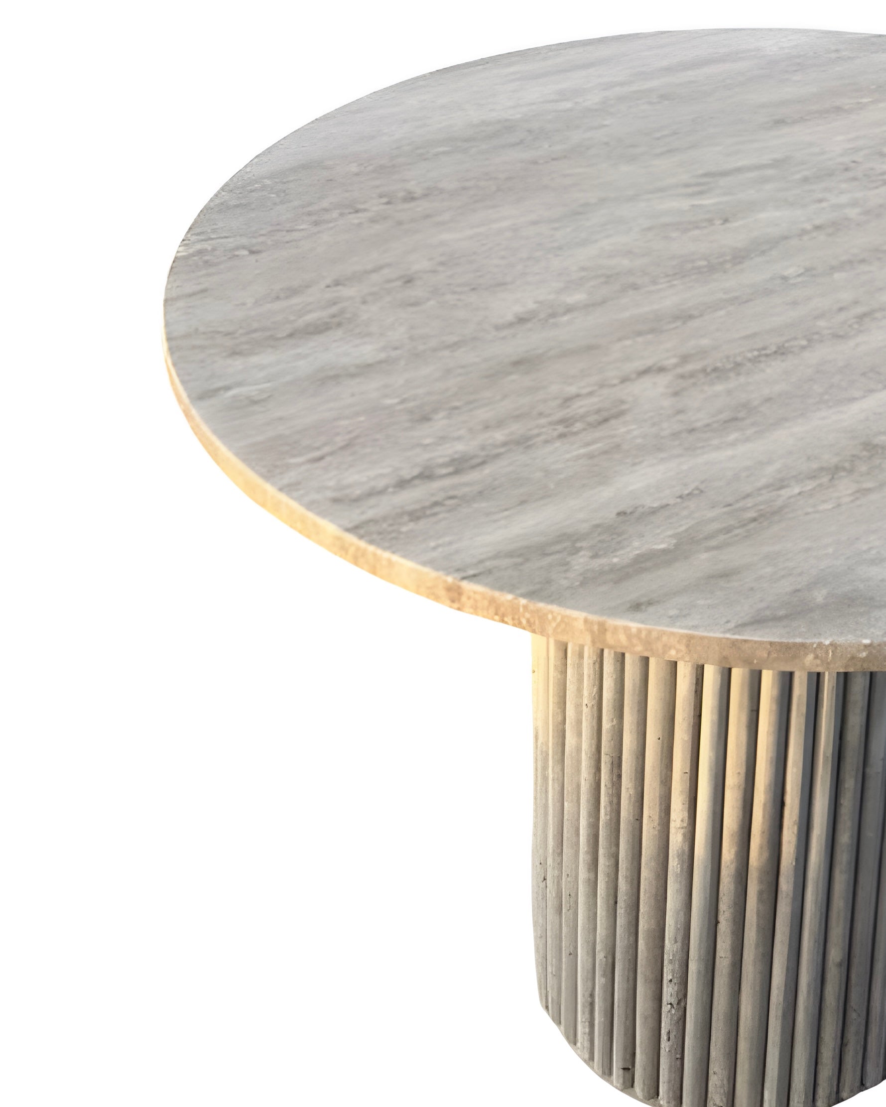 Der Esstisch Skoura besticht durch seine skulpturale Silhouette und die zeitlose Eleganz des Natursteins. Benannt nach der geschichtsträchtigen Oase Südmarokkos, vereint dieses handgefertigte Unikat eine massive, kannelierte Mittelsäule mit einer perfekt proportionierten runden Tischplatte. Tizi ist mehr als ein Möbelstück - es ist ein architektonisches Statement, das natürliche Beständigkeit und modernes Design in Ihrem Esszimmer vereint.
