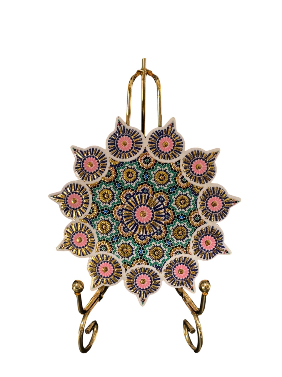 Das Set besteht aus sechs Untersetzern, inspiriert von marokkanischen Fliesen. Die Untersetzer verleihen jedem Tisch einen Hauch Farbe und orientalischen Charme. Sie eignen sich ideal für den Empfang von Gästen, als besonderes Geschenk oder zur stilvollen Dekoration des Zuhauses.